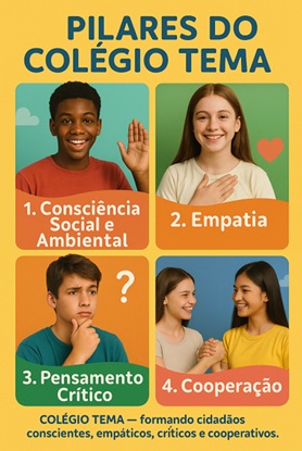 O Colégio Tema baseia sua proposta educativa em quatro pilares fundamentais: pensamento crítico, empatia, conscientização social e ambiental, e cooperação. Esses princípios orientam nossas ações e refletem o compromisso com a formação integral do aluno — estimulando o pensamento reflexivo, o respeito ao outro, a responsabilidade com o planeta e o trabalho em equipe. Assim, formamos cidadãos preparados para transformar o mundo com consciência, sensibilidade e propósito.